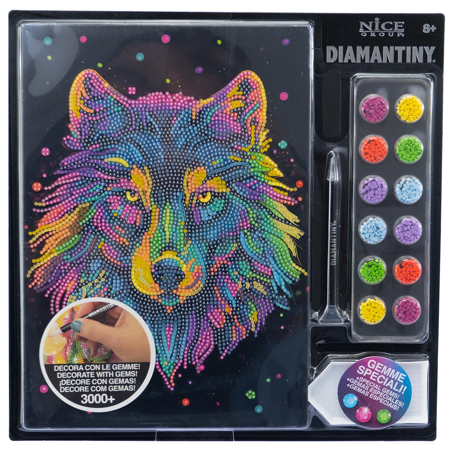 CONTENUTO: 1 quadretto con base adesiva e guida colore, 3000+ cristalli colorati e gemme speciali, 1 vassoio raccoglitore, 1 penna applicatore e 1 quadratino di cera.